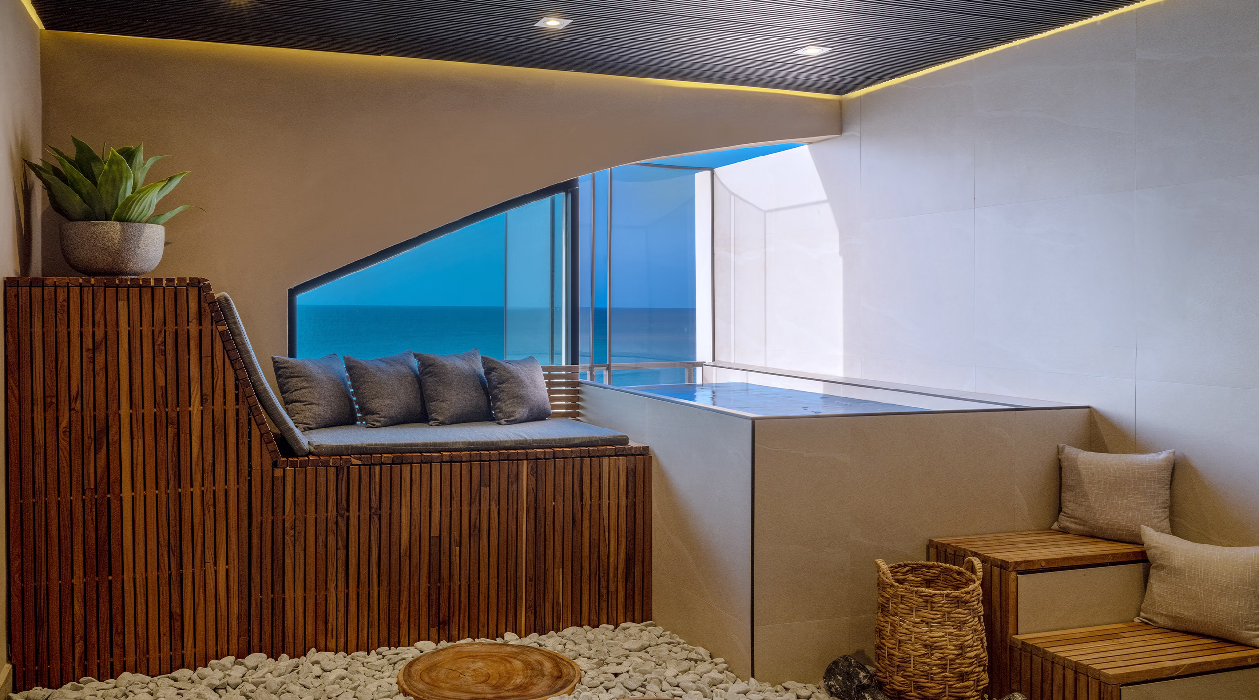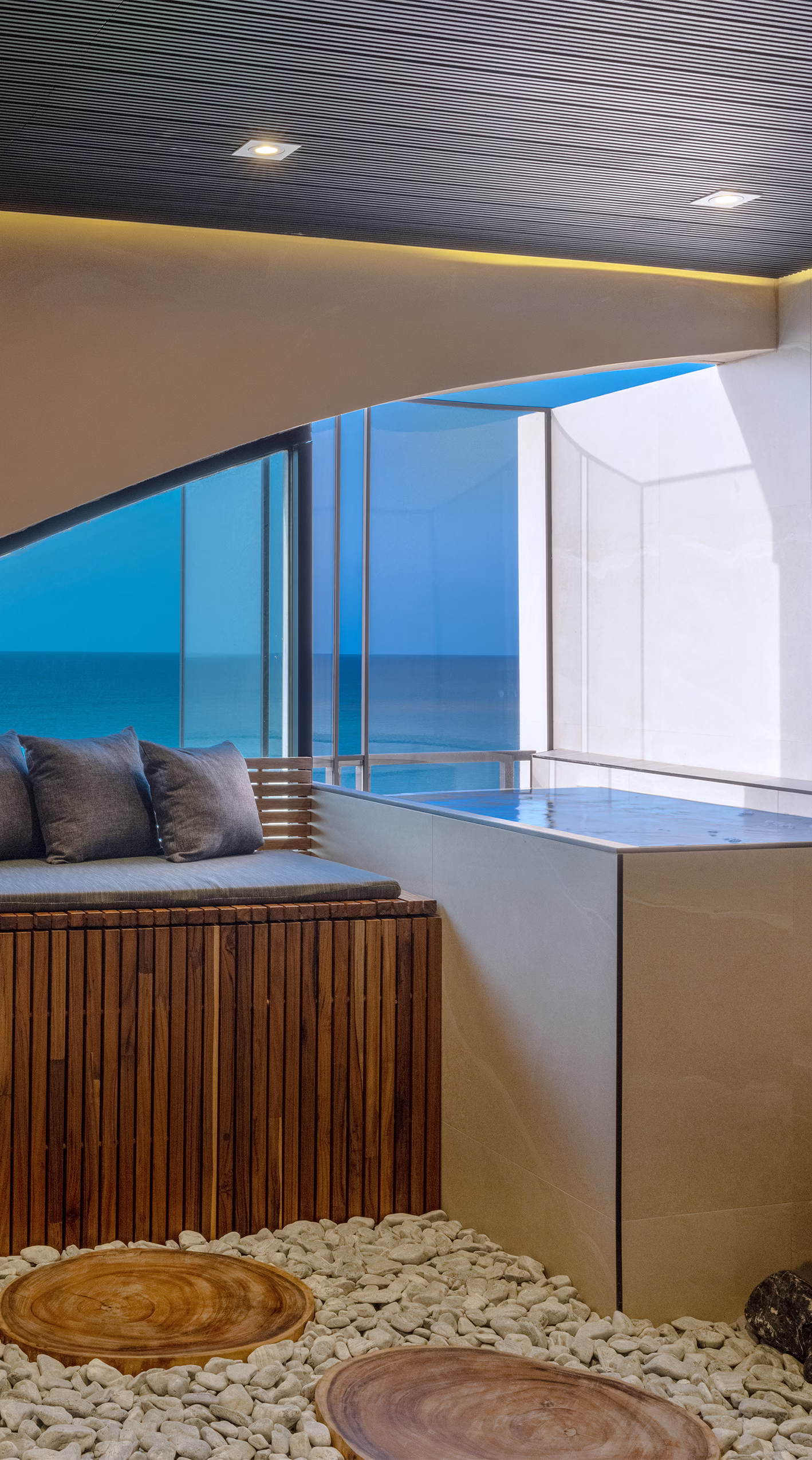 The Agua suite is set on the top floor and directly faces the amazing turquoise blue waters of the Caribbean. The master suite offers a separate one-bedroom king size suite with an open design shower experience. A spacious Indoor-outdoor seamless living room with an unexpected, beautiful Zen Garden that hosts an infinity heated plunge pool, perfect for absorbing the dramatic views of the sunset.